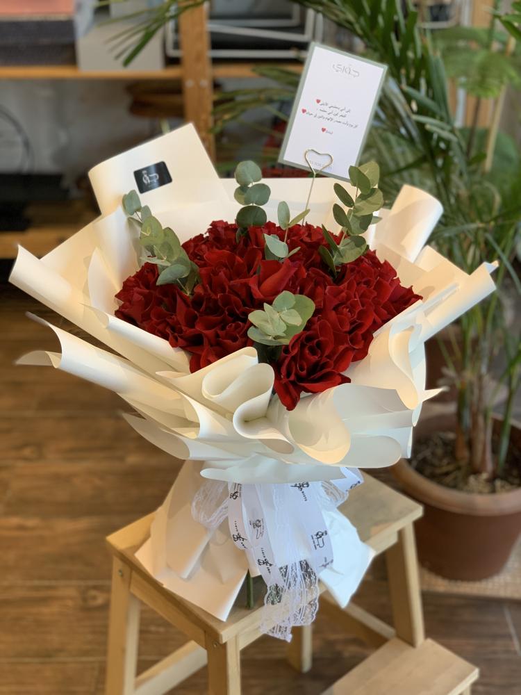 باقة أنيقة من الورود الحمراء الفاخرة، مرتبة بعناية داخل تغليف قماش أبيض مموج يبرز جمال الورود وكثافتها. الباقة تحمل طابعًا كلاسيكيًا يعكس معاني الحب والعاطفة القوية، ومرفقة ببطاقة اهداء تزيدها تميزًا، مما يجعلها هدية مثالية للتعبير عن المشاعر بلمسة راقية